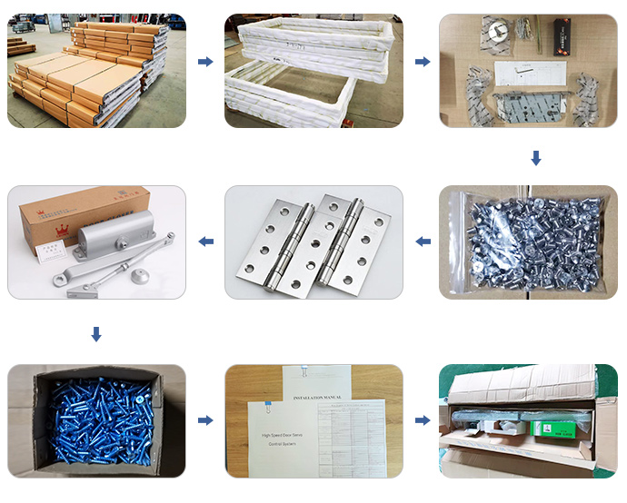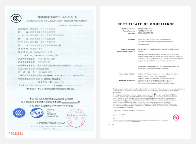 鋼質防火門是指用冷軋薄鋼板作門框、骨架、門板,在門扇內填充不燃隔熱材料,根據需要可以在門扇上安裝復合防火玻璃及門扇上方設有A類復合防火玻璃亮窗,并配以防火五金配件所組成的能滿足耐火完整性和隔熱性要求的門。鋼質防火門按耐火極限可分為甲 級、乙級、丙級三類防火門,其耐火極限要求分別為72min、54min和36min。鋼質防火門應采用冷軋薄鋼板制作門框、門扇面板及加固件。門框與門扇鋼板厚度分別為1.2mm~1.5mm和0.8mm~1.2mm。加固件鋼板厚度為1.2mm~1.5mm,如設有螺孔則不低于3mm。用于鋼質防火門的五金配件需要是耐火五金配件,主要五金配件為:防火合頁(鉸鏈)、防火插銷、防火門鎖、防火順序器和防火閉門器等。