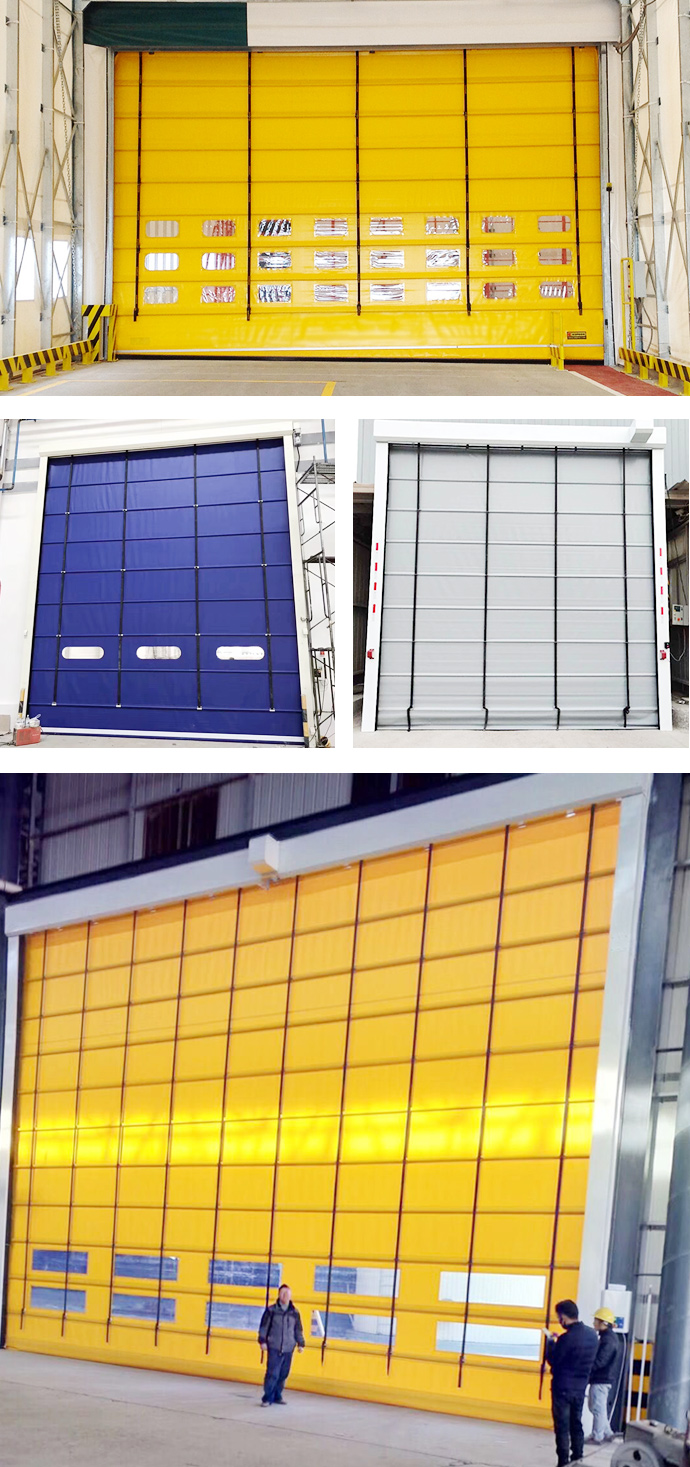 堆積式快速門是快速門當中構造很簡單的一種門型,堆積式快速門一般的組成部分是由動力提升機頭、簾布、抗風桿、立柱、伺服電機、控制箱這幾部分組成。簾布的材質是由1.2mm的單層pvc簾布制成,中間以抗風桿加固,其運行速度達到0.8m/s,相對來說構造簡單,功能上只能起到防風防塵隔離作用。